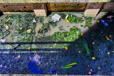 City Polluting the environment. Drainage pipe discharging waist products directly into the river, shot with copy-space