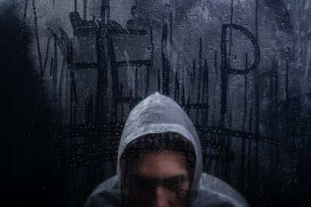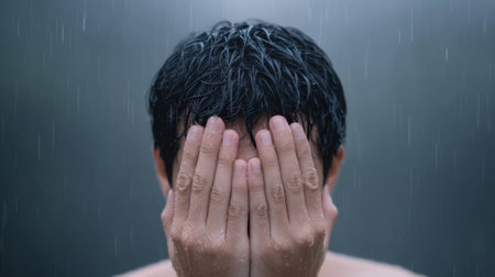 A poignant image of a young man standing in the rain, covering his face with hands, reflecting deep emotions of sadness and solitude. Perfect for storytelling.