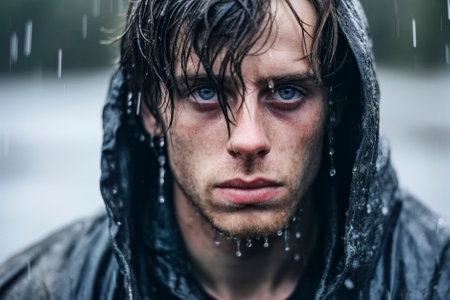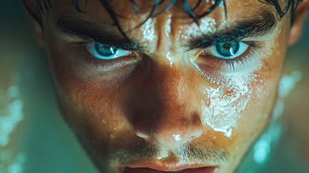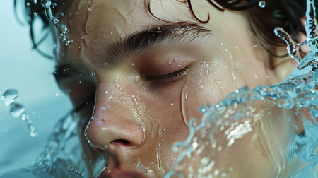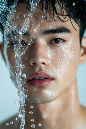 A stunning close-up shot of a young man's face with glistening water drops enhances the natural beauty, revealing his intense gaze and skin texture.