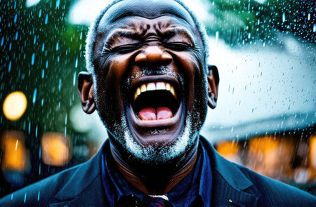 upset depressed senior black man screaming, crying at street under rain. shock, emotional breakdown.