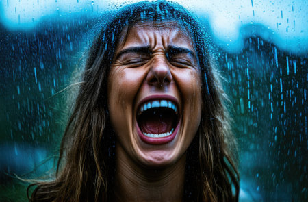young Caucasian girl screaming, crying in pain under rain. shock, emotional breakdown, depression