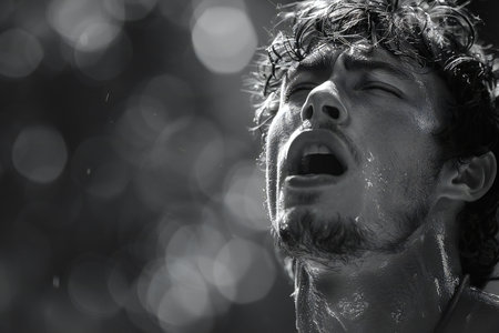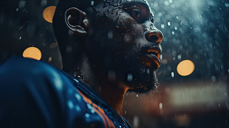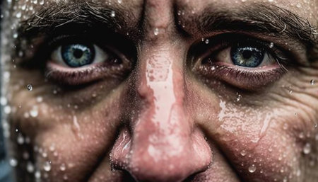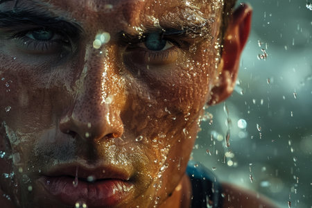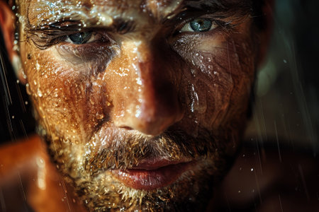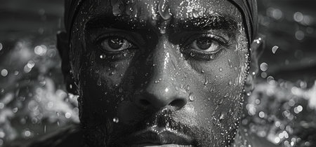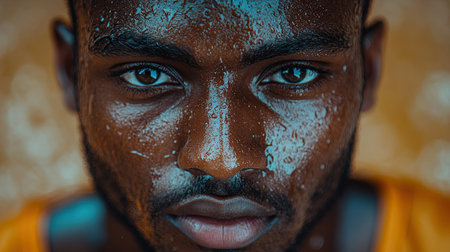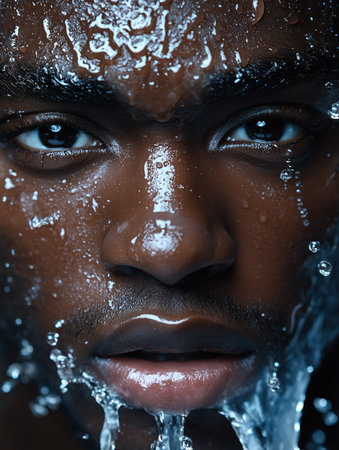 A captivating portrayal features water cascading down the front of an African male's face. The subject's expression is intense, allowing for a deep emotional connection.