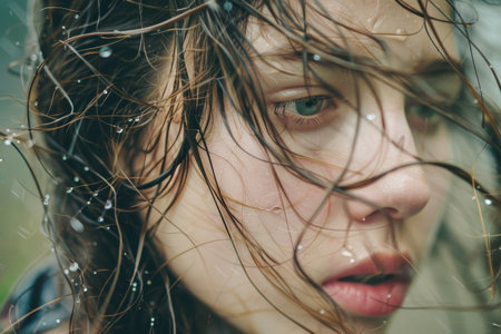 Close up of a woman with wet hair, hair strands sticking to her face, A charming girl with wet hair tousled by the breeze