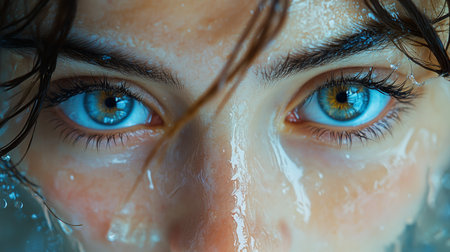 A stunning close-up of piercing blue eyes surrounded by water droplets, capturing an intense and captivating gaze.