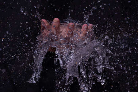 A mans hand in a spray of water in the sunlight against a dark background. Water as a symbol of purity and life