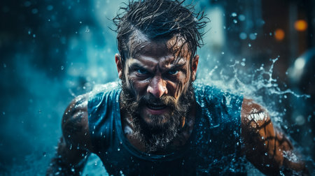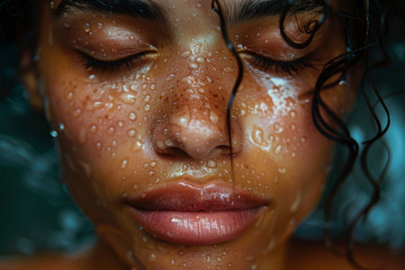 A vibrant portrait capturing shimmering droplets on damp skin, kinetic water spray, and tousled hair conveying freshness and dynamic energy.