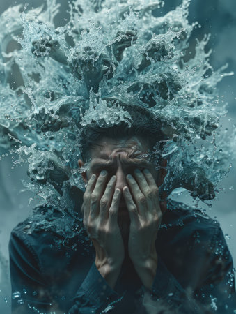 Extreme close-up of a man's intense face with water splashing, expressing panic and emotional pressure.