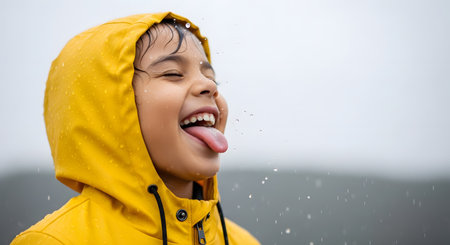 A joyful child wearing a bright yellow hooded raincoat laughs with their eyes closed and tongue stuck out to catch raindrops. The child is having fun and enjoying the simple pleasure of playing in the rain. The image captures the innocence and happiness of childhood.