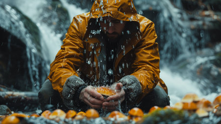 A man with curly hair stands in front of a waterfall, tilting his head back as he drinks from the rushing water. The cascade of water creates a misty spray around him, and the surrounding forest is lush and green.