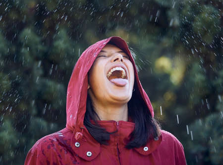 Without rain, there wont be rainbows. a young woman sticking out her tongue to feel the rain outside.