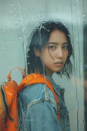 A young woman gazes serenely through a rain-streaked window, her vibrant orange backpack and denim jacket contrasting against a soft greenish background The rain-washed light creates a dreamy atmosphere, highlighting her captivating gaze and capturing the essence of youth and tranquility AI Generative