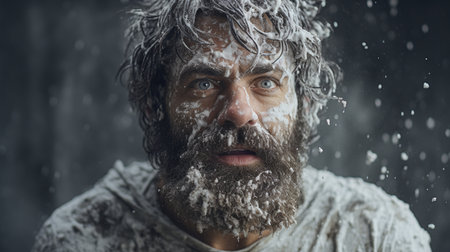 A close-up shot of a man enjoying a shower, with water droplets sparkling on his face and beard. The image captures a moment of relaxation and refreshment, highlighting the beauty of self-care.