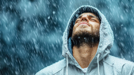 A man stands in a busy city street, rain pouring around him. He wears a hooded jacket and appears relaxed, breathing in the fresh, wet air while closed eyes suggest tranquility.