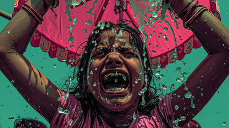 Woman screaming while breaking free from water bubble, expressing desperation and struggle for liberation