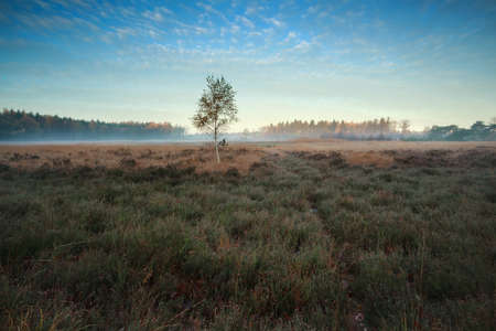 Looking over moorland under a beautiful blue sky at Hoge Veluwe national park, The Netherlands.
