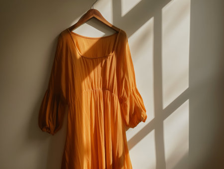 An orange dress with puffy sleeves hangs on a wooden hanger, bathed in soft sunlight streaming through a window