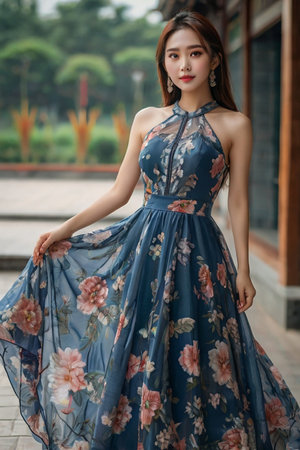 Portrait of a beautiful asian woman in blue dress, Thailand.
