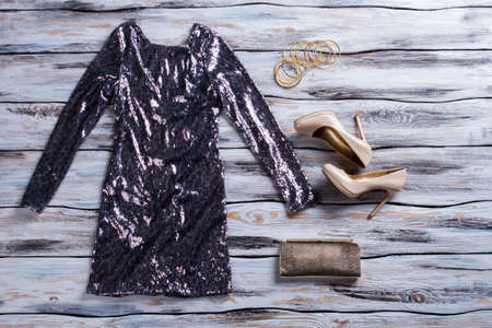 Women's black dress with sequins on hanger on light background. Top view. Stylish party accessories.