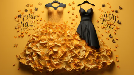 Little black dress and creative evening dress made of yellow autumn leaves on a yellow background. Flat lay. Fashion and retail concept. Copy space.