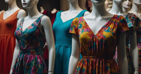 AI Generated. A lineup of mannequins, each adorned with colorful dresses, on display at a clothing store