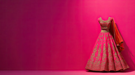 Indian women's costume dress presented on a bold pink backdrop, creating a striking fashion display with room for text