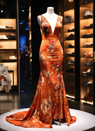 Elegant luxury dress on display in mall with copy space, fashion boutique showcase