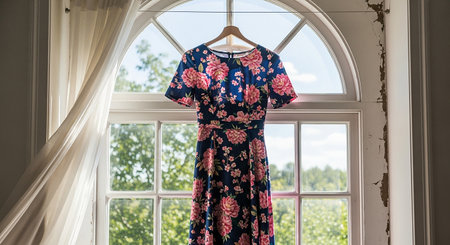 A beautiful floral dress hangs gracefully by a wooden door, illuminated by natural light from the window, creating a serene and inviting atmosphere perfect for vintage decor lovers.