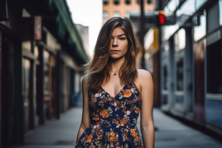 Plus size girl in a floral dress stands gracefully at dusk, showing her stylish earrings and confident expression in a city setting.