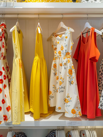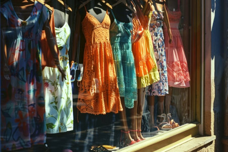 Explore this vibrant display of summer dresses and chic fashion in a sunny boutique window. Perfect for your seasonal wardrobe update. Style Trend. Generated A.I.