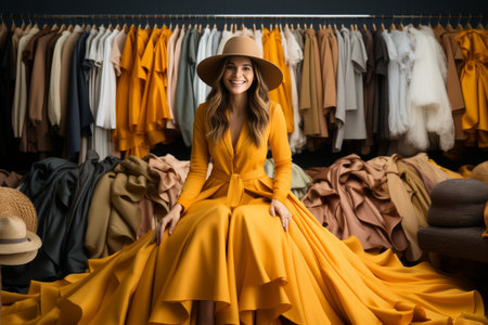 Woman in shop or wardrobe picking clothes from hangers, making perfect elegant summer dress outfit. Fashion and style concept.