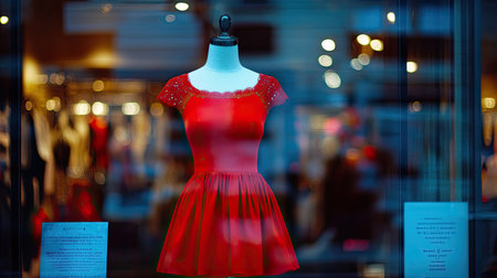 A breathtaking red evening gown is showcased in a luxurious boutique, surrounded by sparkling lights and elegant mirrors, perfect for special occasions and events.