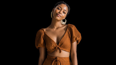 A glamorous model in a sparkling gold dress radiates elegance and confidence at a nighttime event, shimmering in the light