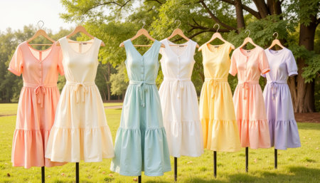 Pastel summer dresses outdoor display, dreamy fashion. generated by ai