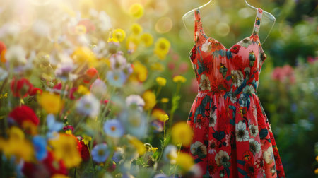 An eye-catching floral dress mockup displayed against a bright, sunny background, appealing to spring and summer fashion lovers, --ar 16:9 --v 6 Job ID: ed6a85be-88fb-4b3e-bf81-e8b3fac57fba