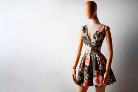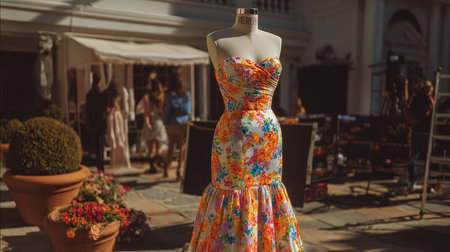 A beautifully designed floral dress on a mannequin, set in an outdoor space drenched in soft sunlight, ideal for showcasing trendy fashion and design.