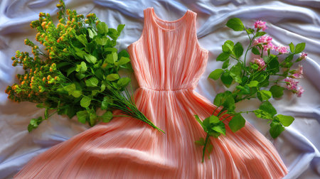A stylish summer dress elegantly placed on a soft fabric background, accompanied by fresh flowers and greenery, creating a vibrant and cheerful atmosphere.
