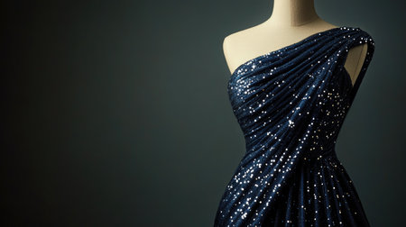 Captivating navy blue evening dress adorned with sparkling sequins, showcased on a mannequin. Perfect for elegant occasions, this design embodies sophistication and style.