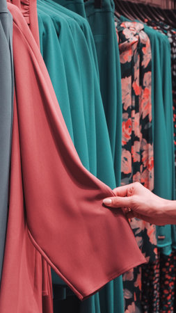 Close-up of female hands plucked hanger choosing clothes in clothing store. Middle aged woman runs across a rack of clothes in a shopping mall. Sale promotion and shopping concept. Part of the series.