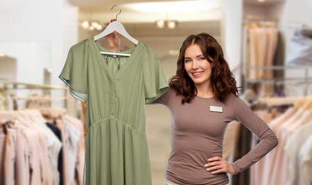 Pregnant woman chooses a loose dress in in a flower. Concept of buying new clothes, fashion, beauty and an active lifestyle while carrying child. Hands close up shot