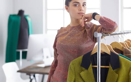 Dressmaker, technologies, fashion designer and tailor concept - young female fashion designer working in her showroom