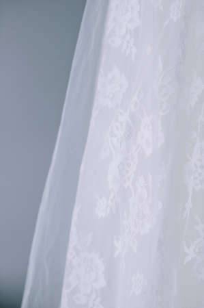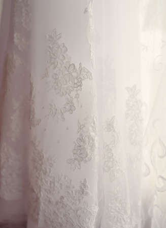 beautiful white wedding dress hanging on a hanger on the background of the window attributes wedding front view close-up