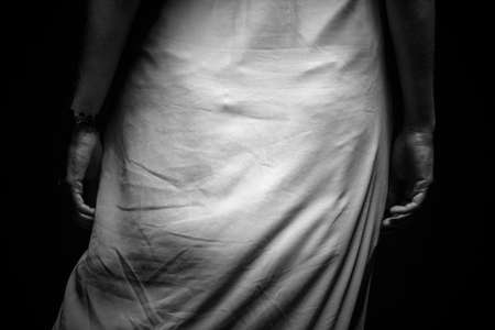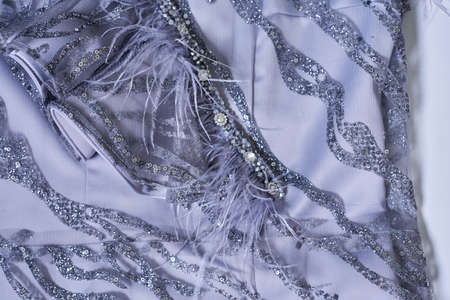 Close-up of gray evening gown. Gray evening dress. Beautiful and trendy women dress