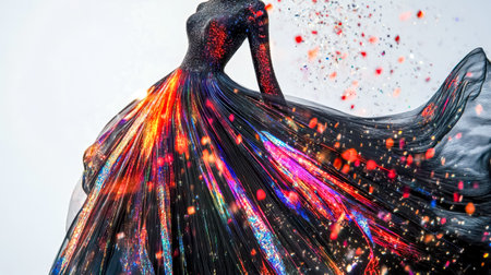 A stunning floral dress billows gently against a softly lit, colorful background. The image exudes elegance and creativity, perfect for fashion and art themes.