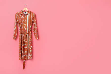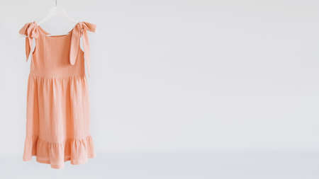 Salmon dress with folds. Cocktail dress on white shelf. Woman's elegant summer garment. Warm-colored piece of clothing.
