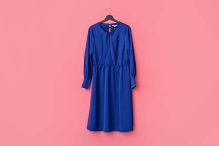 A stunning floral dress elegantly hangs on a blue wall, capturing the essence of vintage fashion. Ideal for showcasing style and beauty in photography projects.