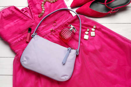 girls clothes which she has bought on sale in the shopping mall. top view cropped photo. style, trendy casual clothes on any event, party. favorite dress
