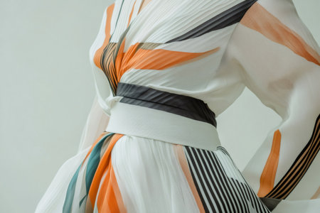 Close up of a stylish pleated dress with a vibrant orange, black, and white striped pattern, cinched at the waist with a white belt, showcasing modern fashion trends