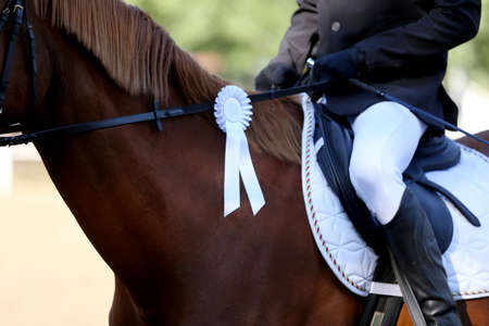Unknown competitor ride a sport horse on equitation event at summertime ourdoors. Show jumper horse wearing award winning ribbon. Equestrian sports. Horsegirl sitting in saddle
