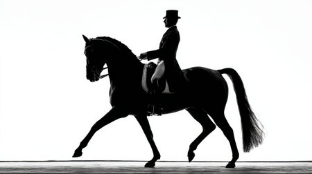 A black silhouette shows a horse with rider in tall hat executing a high level dressage move. The horse appears to be in mid-step against a white backdrop.