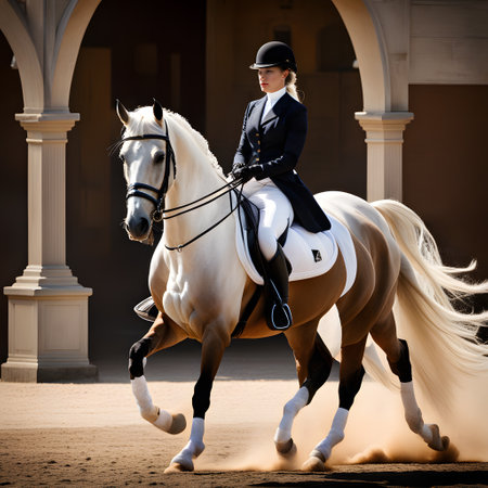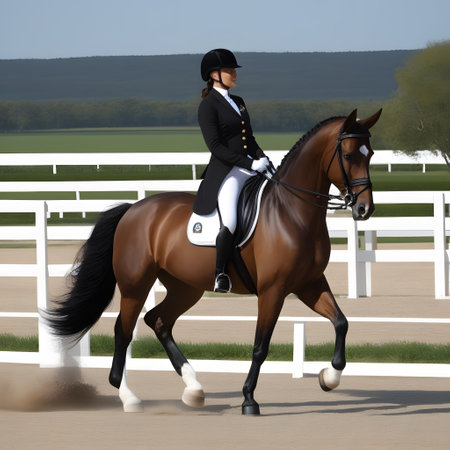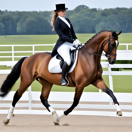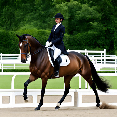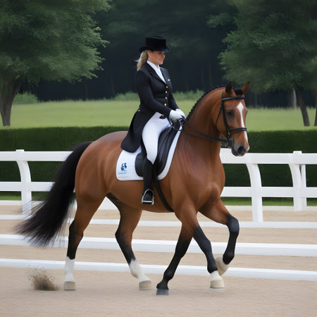 Equestrian sport, dressage competition with horse and rider performing, outdoor scene with natural light, horse show event, skill and precision, summer day in the park.